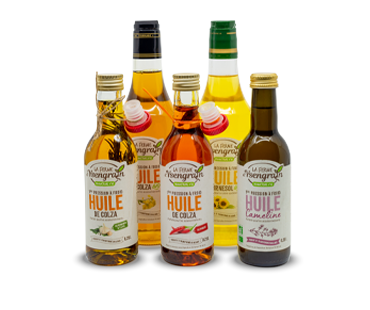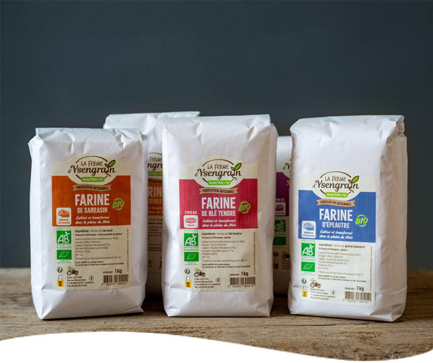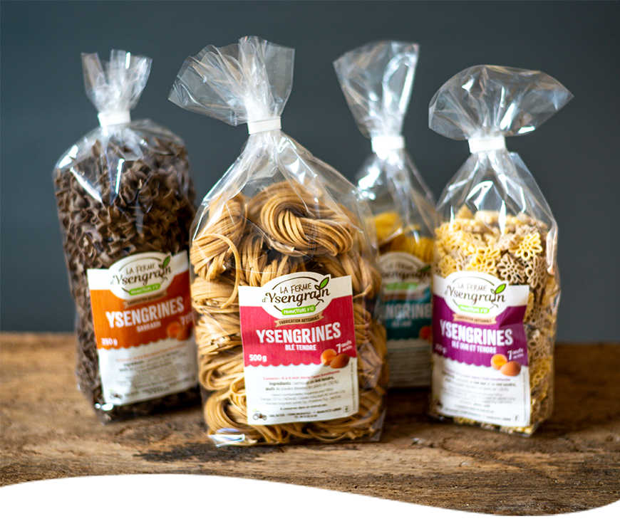 Les céréales sont transformées en farines grâce à notre moulin, et les oléagineux sont pressés à froid sur place. La ferme propose également des nouilles aux œufs frais (les œufs sont aussi produits sur la ferme).